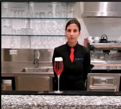 Veronica versa il liquido rosso, poi impugna il sifone e aggiunge la