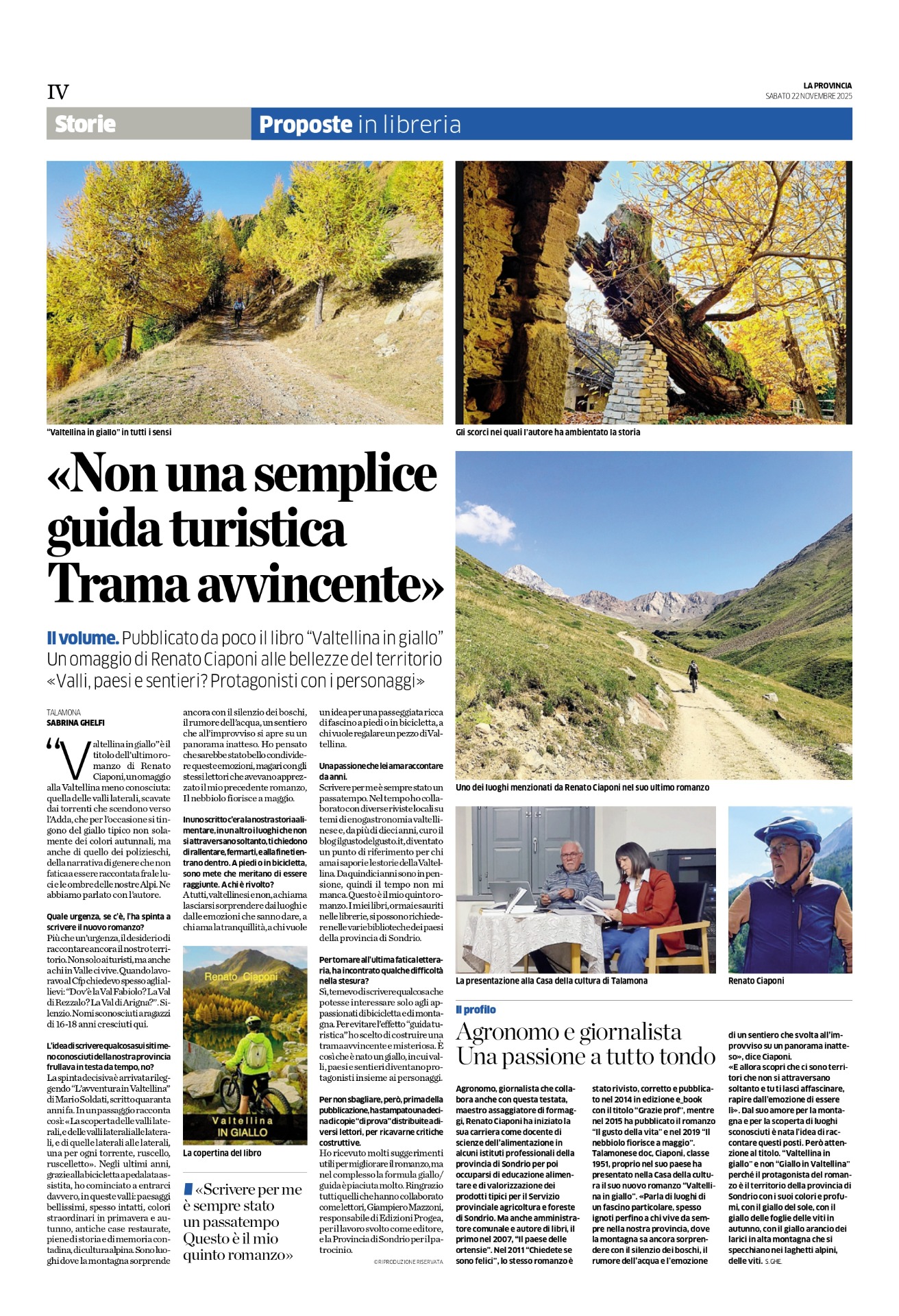 "Valtellina in giallo" è il titolo dell'ultimo romanzo di Renato Ciaponi, un omaggio alla Valtellina meno conosciuta: quella delle valli laterali, scavate dai torrenti che scendono verso l'Adda, che per l'occasione si tin gono del giallo tipico non sola mente dei colori autunnali, ma anche di quello dei polizieschi, della narrativa di genere che non fatica a essere raccontata fra le lu ci e le ombre delle nostre Alpi. Ne abbiamo parlato con l'autore.