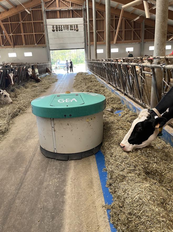 Mentre parla, un piccolo robot scorre quasi in silenzio lungo il corridoio, spingendo il foraggio verso gli animali. Poco più in là, una ruspetta pulisce costantemente il pavimento.