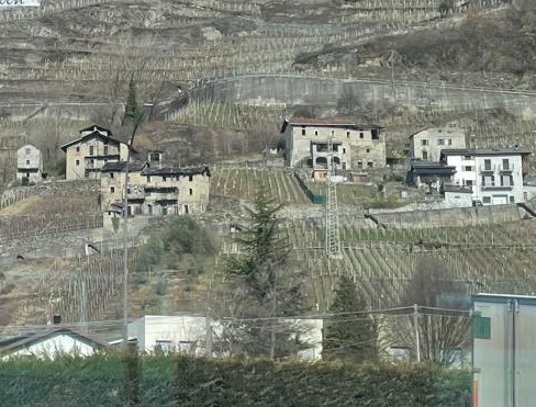 Fuori, la valle si presenta ancora come un territorio che non ha reciso del tutto il legame con l'agricoltura: prati stabili, stalle in mezzo al verde, campi pronti per la crescita di foraggere, segni di un'economia paziente e concreta. E poi, a un certo punto, i vigneti terrazzati emergono quasi improvvisi, come una rivelazione. La loro trama ordinata, antica, racconta un lavoro stratificato nel tempo, un modo di sfruttare la pendenza e di trasformare la montagna senza violentarla. Sicuramente allo spettatore attento, seduto su quei sedili viene voglia di rivederli in un'altra stagione: in primavera, quando la valle riprende fiato, in estate, o soprattutto in autunno, quando il foliage accende i versanti e quel paesaggio, potrebbe acquistare una profondità ulteriore, più intensa, quasi meditativa.