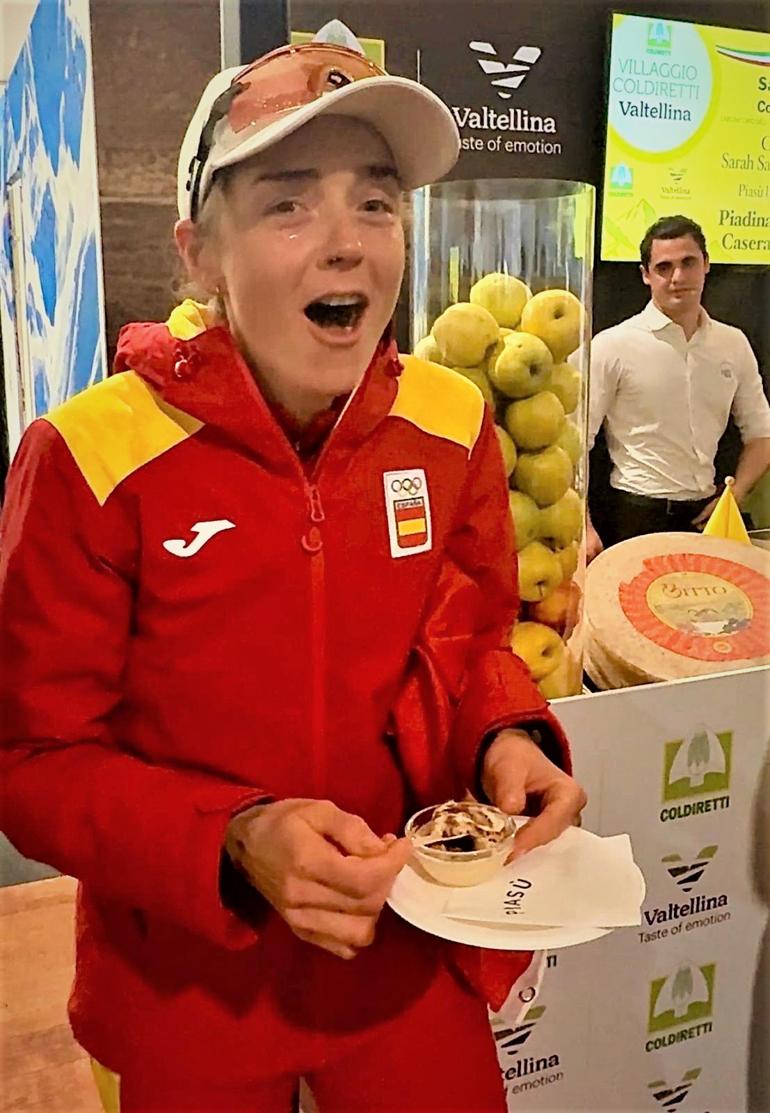 E poi succede qualcosa che cambia la scena, all'improvviso la tensostruttura si anima: voci, applausi, canti. Il cooking show non si ferma davvero, piuttosto si trasforma, perché arriva una notizia che qui diventa festa: sta arrivando la campionessa spagnola Ana "Anita" Alonso che ha scelto proprio il Villaggio Coldiretti Valtellina per celebrare con i suoi sostenitori la medaglia di bronzo conquistata oggi nello sci alpinismo. E la sua celebrazione si mescola al resto: tifosi e pubblico, entusiasmo da stadio, sorrisi, foto, cori.